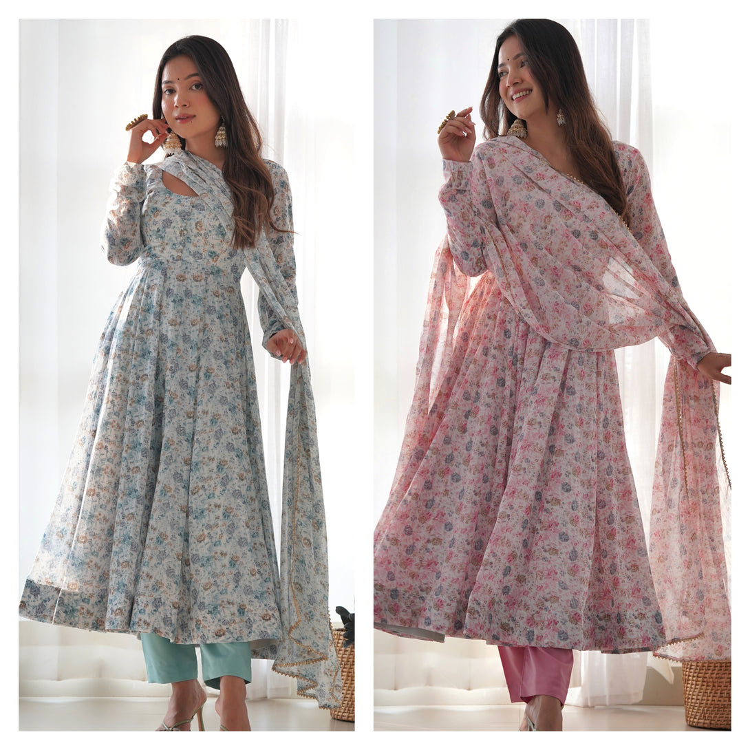 Unique Chiffon Floral Print Sky Blue And Pink Color Anarkali Suit KB-262